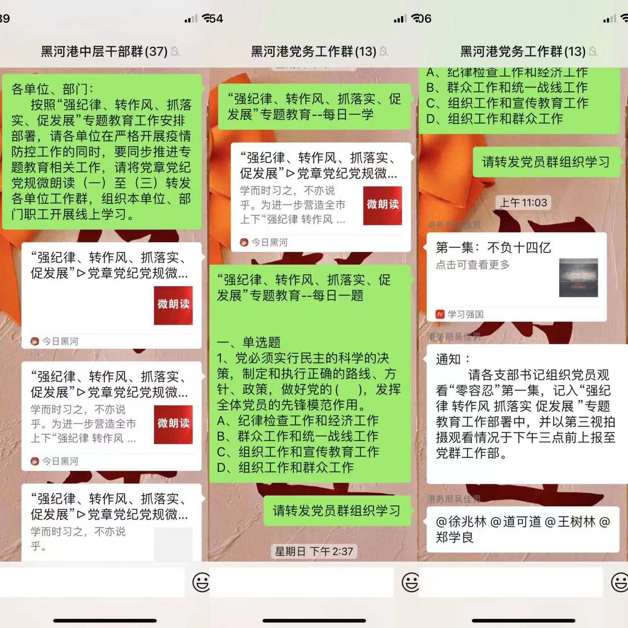 自专题教育开展以来,党员领导干部克服疫情防控无法开展集中学习的实际,在坚决做好疫情防控值守工作的同时,教育与值守两不误,采取居家及值守闲暇时线上自学模式,打破时间地点上的限制。黑河港党委通过微信工作群推送“每日一学”、微信答题“每日一题”、观看电视专题片《零容忍》、以考促学等形式学习党规党纪,督促党员干部把纪律规矩挺在前面,知敬畏、存戒惧、守底线。